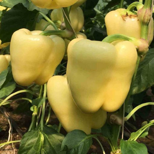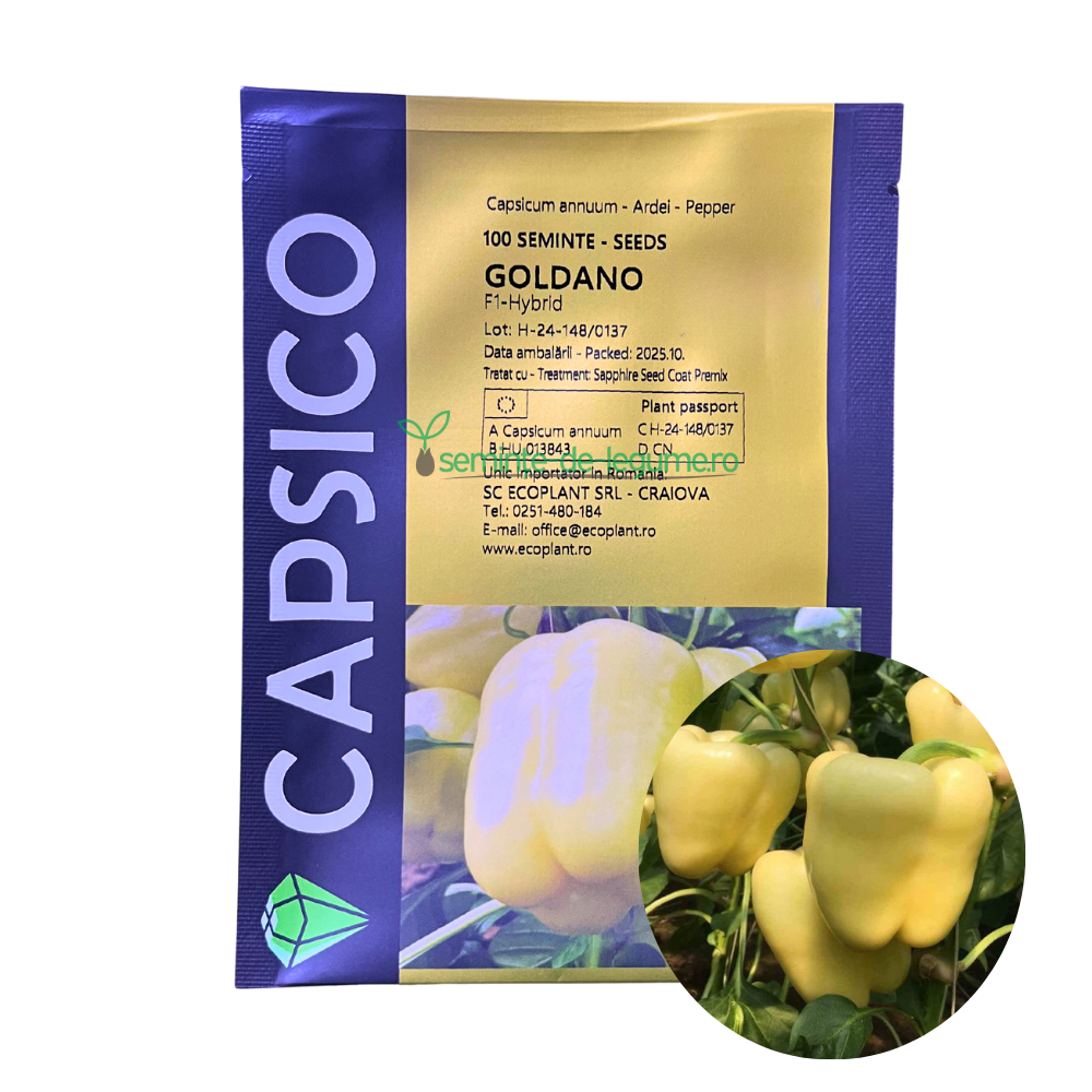 Fructele ardeiului Goldano F1 au o grosime de 7-9 mm in pulpa, dimensiune de 8-10 cm, exterior lucios de culoare alb-galbui, greutate medie de 170 - 200 grame, in 3-4 lobi.